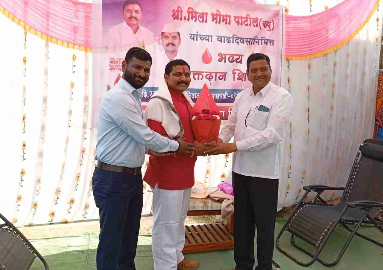दरम्यान भिला पाटील थोर रक्तदाते म्हणून तालुक्यात प्रसिद्ध असून त्यांनी आजवर शंभराच्यावर रक्तदान केले आहे.आडगाव येथे आज दि.२२ नोव्हेंबर शनिवार रोजी जीवन ज्योती रक्तपेढी धुळे यांच्या वतीने भिलाजी पाटील यांच्या वाढदिवसानिमित्ताने रक्तदान शिबिराचे आयोजन करण्यात आले.सदर शिबिरात वेदांत कुलकर्णी,अक्षय बोरसे,ज्ञानेश्वर पाटील,राजेंद्र जगताप,सुनीला गावित, डिंपल पाटील,आदिती येवले यांनी रक्त संचय प्रसंगी भाग घेतला.प्रसंगी आडगाव येथे पंचायत समितीचे माजी सभापती प्राध्यापक भरत सर यांनी तसेच सेनादलातील जवान मुकुंदा जोशी,रमेश जे. पाटील यांनी भिलाजी पाटील यांना पुष्पगुच्छ देऊन अभिष्टचिंतन केले.यावेळी आडगावचे माजी सरपंच रावसाहेब पाटील,शेतकी संघाचे प्रेसिडेंट सुनील पाटील,संचालक श्यामकांत पाटील,चोपडा साखर कारखान्याचे संचालक पंडित रामदास पाटील,सेनादलातील जवान मनोज चौधरी,धनराज बाविस्कर,मंगल प्रताप पाटील,हर्षल मंगल पाटील आदींनी त्यांचे कौतुक केले.भिला पाटील यांनी रक्तदान केल्याचे सेंचुरी गाठल्याने त्यांनी जिल्ह्यात आडगावचा नावलौकिक मोठा केला आहे अशा शब्दात डॉक्टर सुरेश पंडित बोरोले यांनी त्यांचा गौरव केला आहे.तालुक्यातील आडगाव येथील थोर रक्तदाते भिला भोमा पाटील यांच्या वाढदिवसानिमित्त आज दिनांक २२ रोजी सायंकाळपर्यंत १९६ बाटल्या रक्त संकलित करण्यात आले.यात जीवन ज्योती रक्तपेढी धुळे यांनी या कामी सहकार्य केले.
